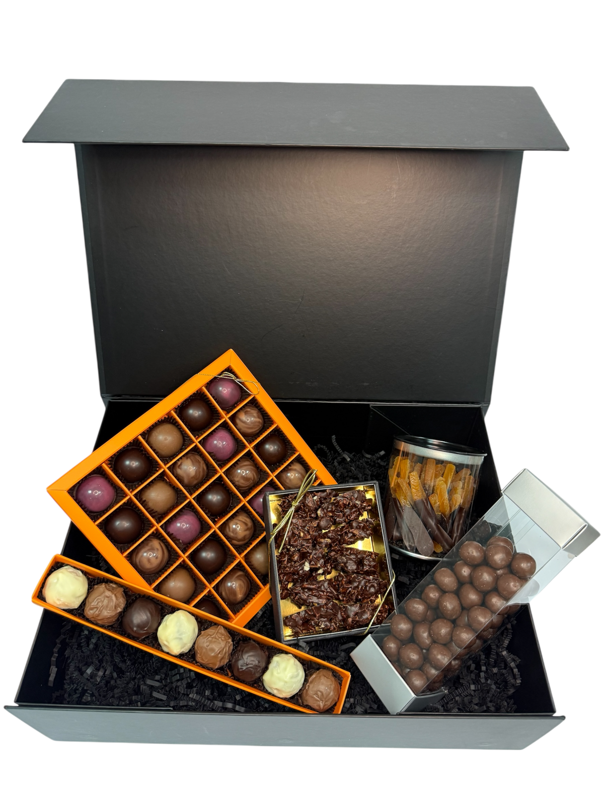 Zestaw prezentowy „Czekoladowa Klasyka” to luksusowe praliny, trufle, draże, skórka pomarańczy w czekoladzie oraz klastry orzechowe, ręcznie wykonane z naturalnych składników. Idealny prezent na urodziny, święta, rocznice czy dla partnerów biznesowych. Ekskluzywna kompozycja smaków – marcepanu, wiśni, gianduji i słonego karmelu – zachwyci każdego miłośnika czekolady.