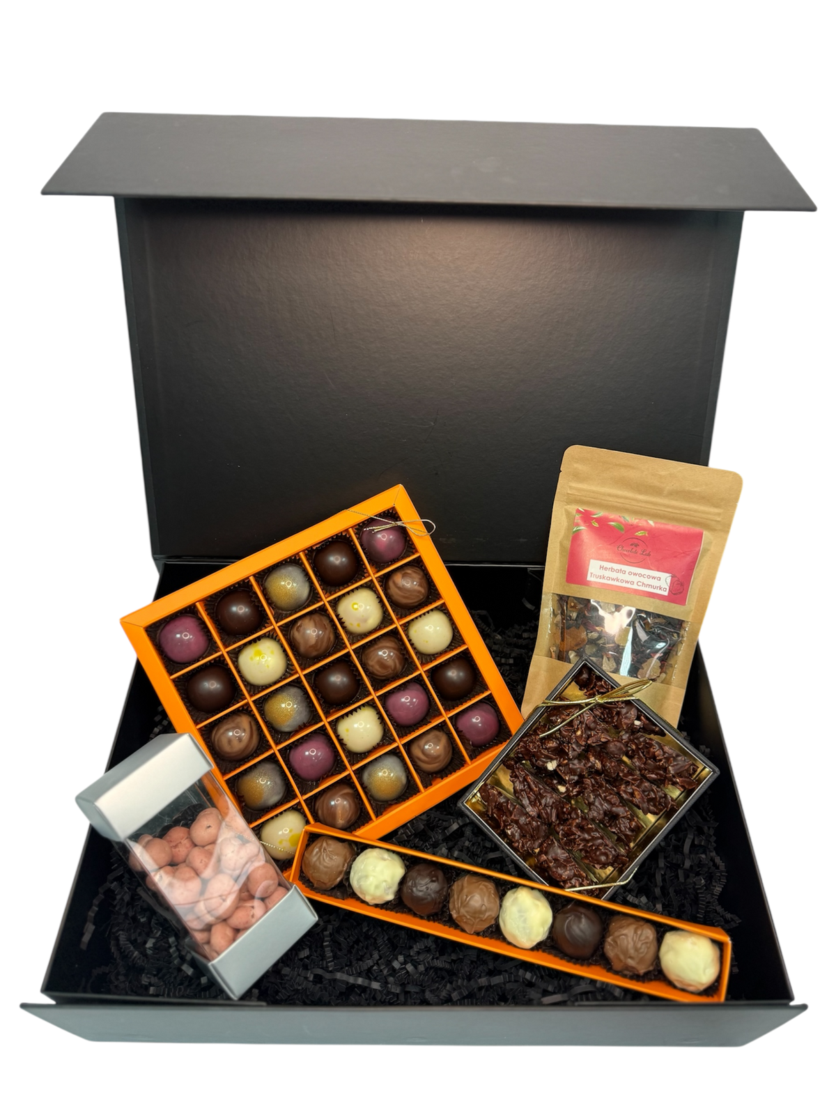 - „Czar Smaków” to ekskluzywny zestaw, który łączy aromatyczną herbatę z ręcznie robionymi pralinami i truflami, oferując niezapomnianą podróż po świecie smaków. Idealny jako elegancki prezent dla bliskiej osoby, przyjaciela lub partnera biznesowego.